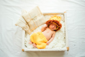 この写真の赤ちゃんとベッドの距離の差はほぼなく、ピントは赤ちゃんに合っているのでボケていません。